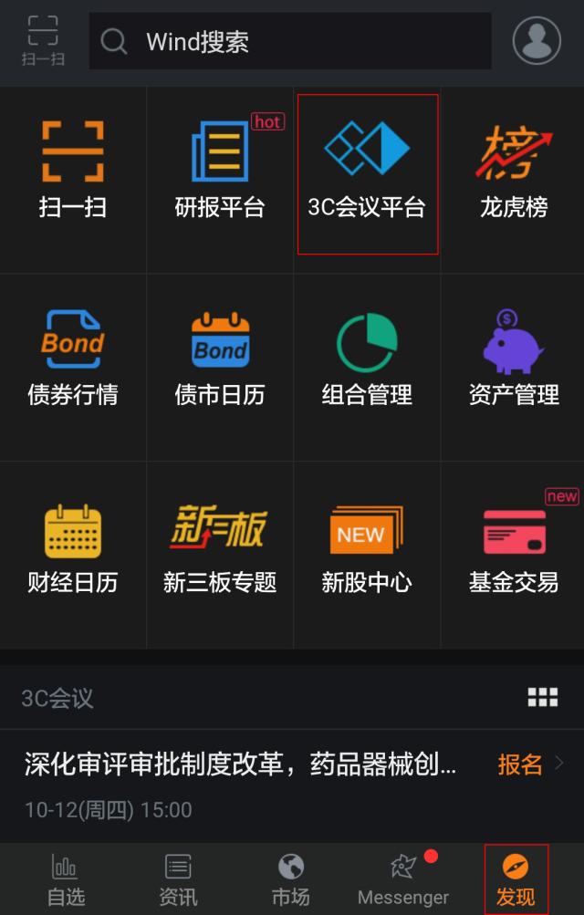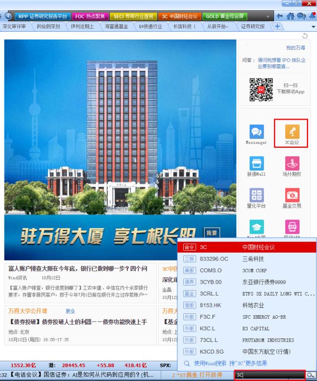 1、点击Wind金融终端首页右侧的“3C会议”或在右下角按键精灵输入“3C”,进入3C会议模块。